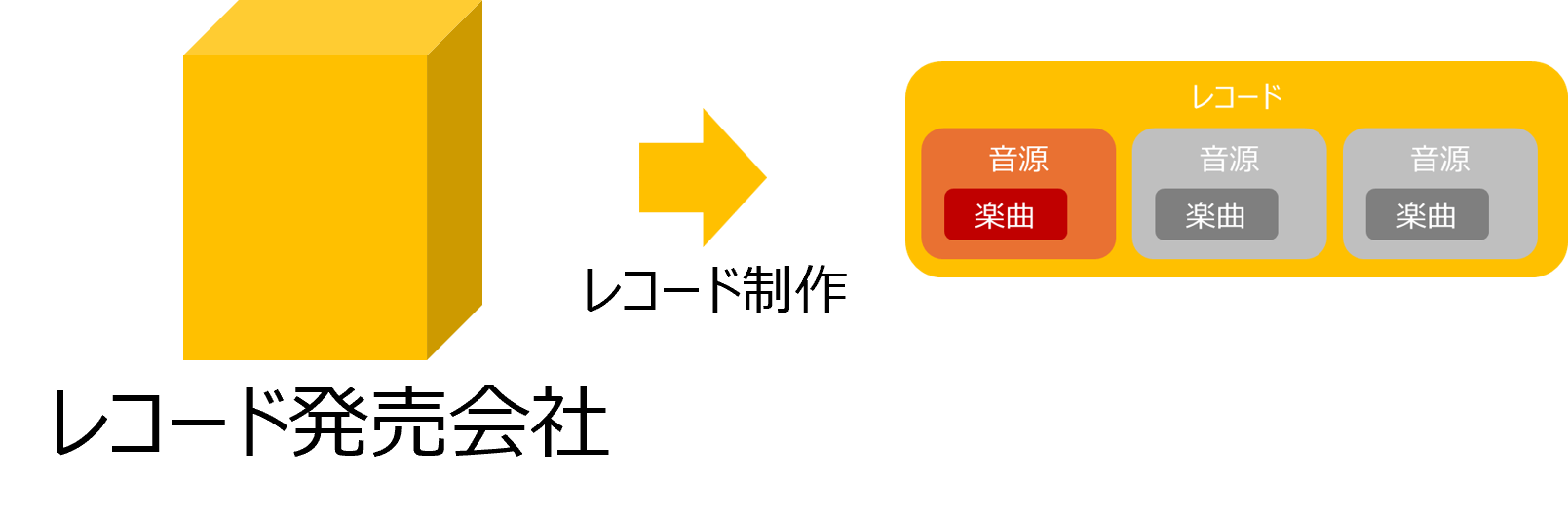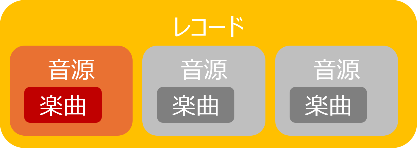まず、レコード(CDも同じ)ですが、なんとなくまるっとレコードだと思いがちですが、 よくよく考えるとマトリョーシュカみたいな構造になっていて、 レコード中にはそれぞれの曲の音源があります。そして音源の中には楽曲があります。 音源=楽曲じゃないことがわかる例をいくつか挙げると、 同じ楽曲でもヴァージョン1(音源1)とヴァージョン2(音源2)がありますし、 例えば「時をかける少女」にはユーミンヴァージョンと原田知世ヴァージョンがあります。 これらは楽曲は同じですが、音源は違います。つまり音源=楽曲ではないのです。 |