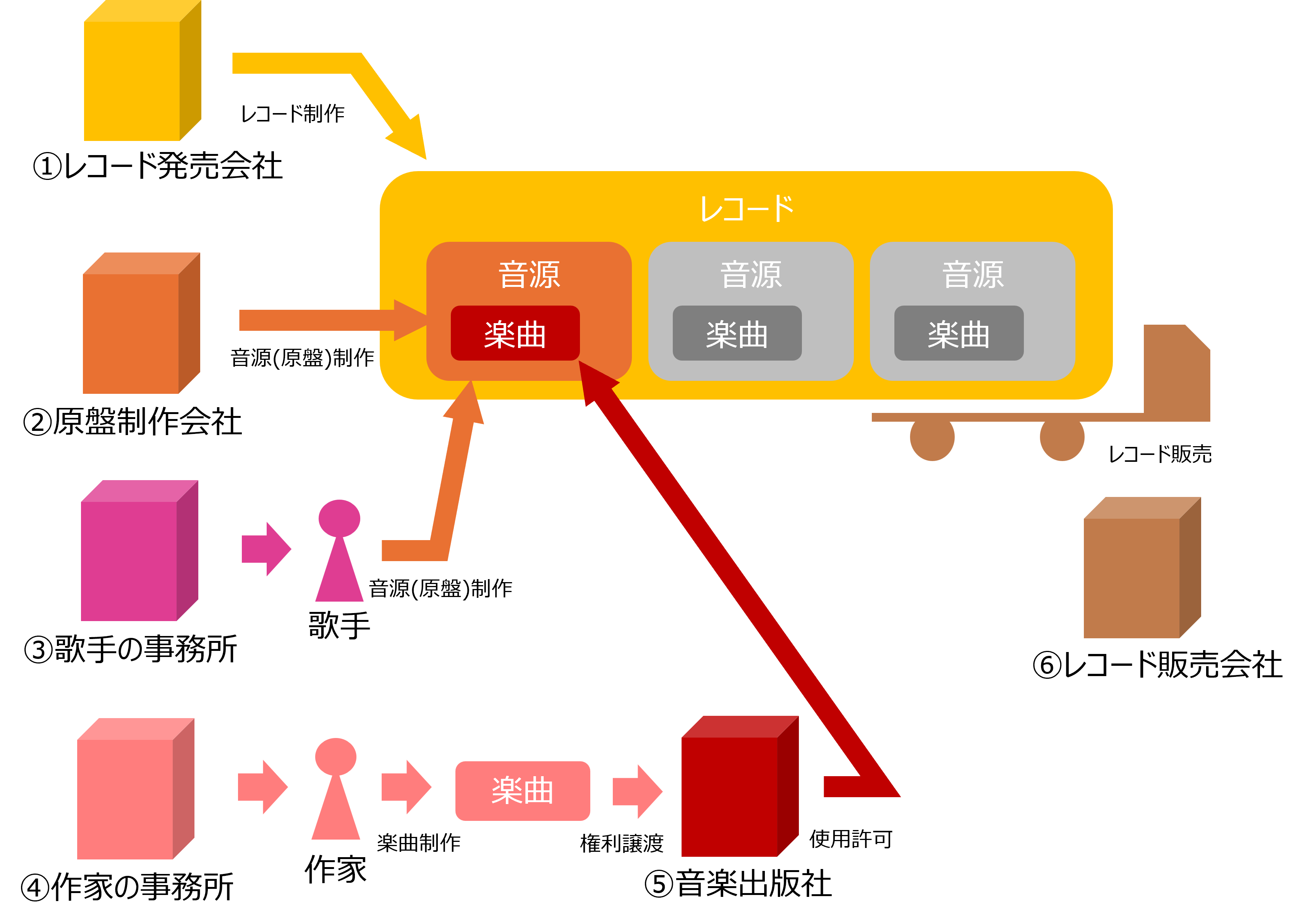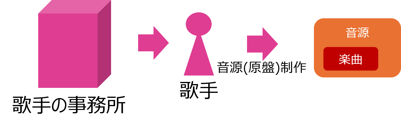 次に、音源には歌が入ってるので、歌手も音源制作に携わってるわけです。 歌手の仕事は歌手の事務所が受注して、この事務所から派遣されてます。 レコーディング以外にもコンサートやメディア出演なども事務所が受注して スケジュール組んで仕事を歌手に提供している感じですかね。 |