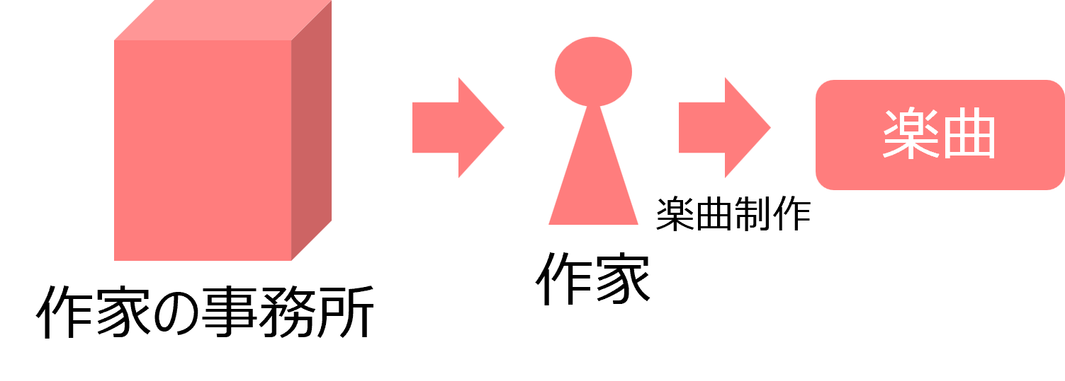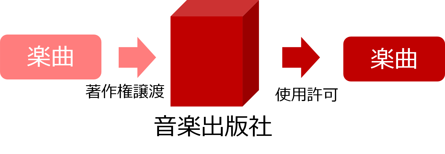 楽曲はもう一段ややこしいステップを踏むようですが、作家は楽曲を音楽出版社に譲渡します。 これはなかなか私のような素人には理解しづらい話ですが、 楽曲の使用権利そのものを音楽出版社に譲渡するようです(つまり作家は権利を持っていない)。 音楽出版社は楽曲の使用許諾を出します。例えばレコーディングする場合は原盤制作会社に出しますし、楽譜にする場合は書籍の出版社に出すという感じです。 JASRACやNextoneのような著作権管理団体もこの音楽出版社と同じレイヤーにあるようです。 主に、音楽出版社はこれから作る制作物に対し、楽曲の使用を許可し、 JASRACなどは既存制作物の使用を許可しているという違いがあるようです。 |